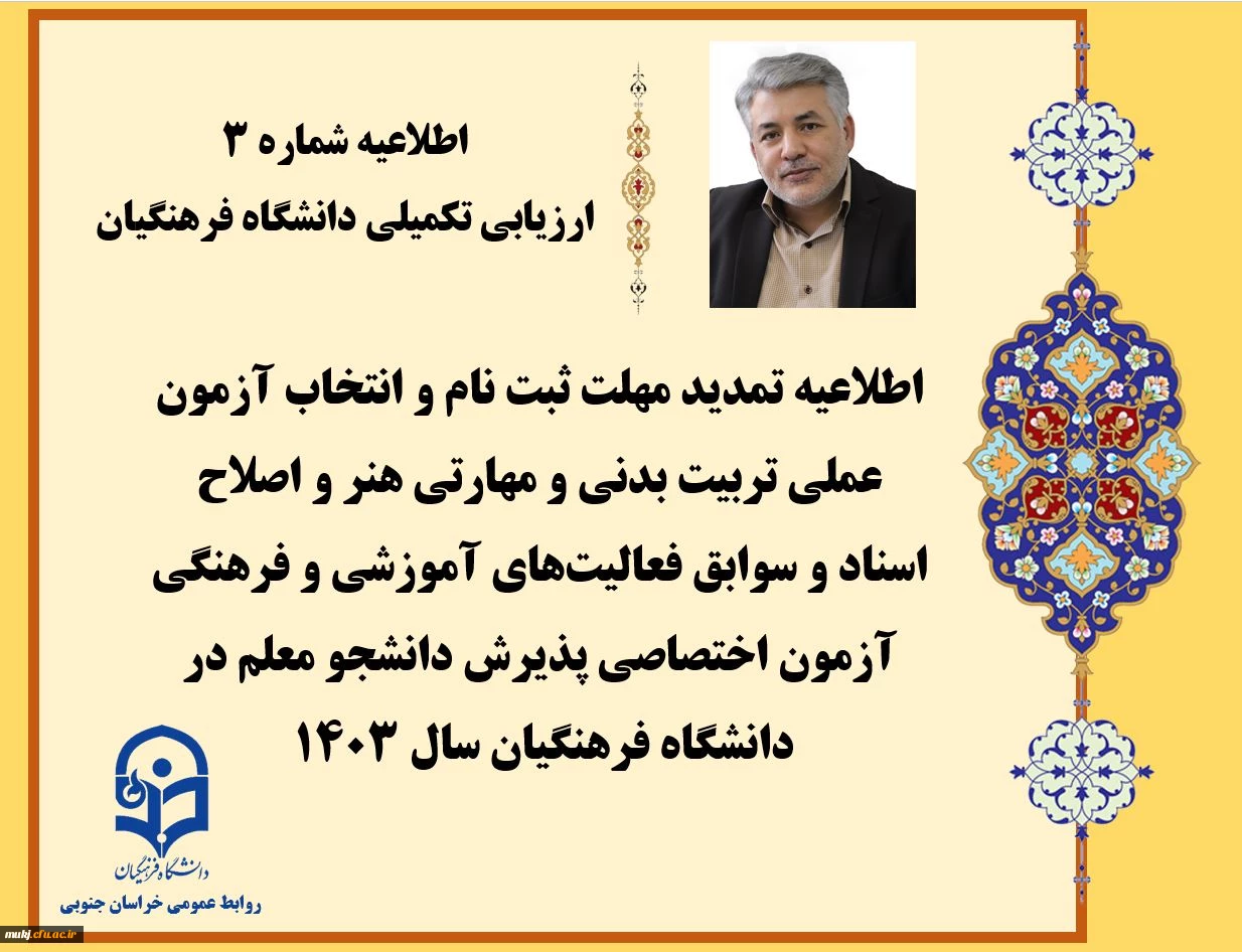 اطلاعیه3: اطلاعیه تمدید مهلت ثبت نام و انتخاب آزمون عملی تربیت بدنی و مهارتی هنر و اصلاح اسناد و سوابق فعالیت های آموزشی و فرهنگی آزمون اختصاصی پذیرش دانشجو معلم در دانشگاه فرهنگیان سال 1403 2